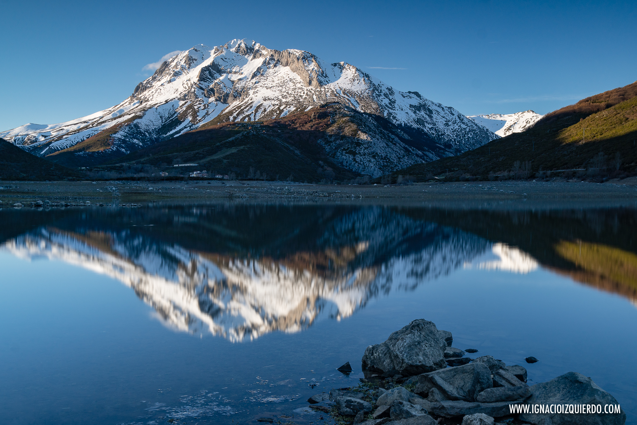Sería curioso ver el paisaje en verano y descubrir por donde caminé. Sé, porque los mapas que llevaba así lo indicaban, que atravesé rios ocultos bajo la nieve, así que quizás mi trail no se parezca en anda a una ruta en verano. Rato después, completado el recorrido y habiendo regresado a la civilización solo quedaba una cosa, acercarse al embalse de Camporredondo a ver si el Espigüete me despedía el día con un buen atardecer y unos buenos reflejos. Obviaré la de barro que tuve que tragar para encontrar un buen reflejo (el embalse estaba bastante bajito de agua) y que las nubes decidieron no unirse a la fiesta pero el Espigüete cumplió y sus piedras se tostaron de tonos rojizos al atardecer.