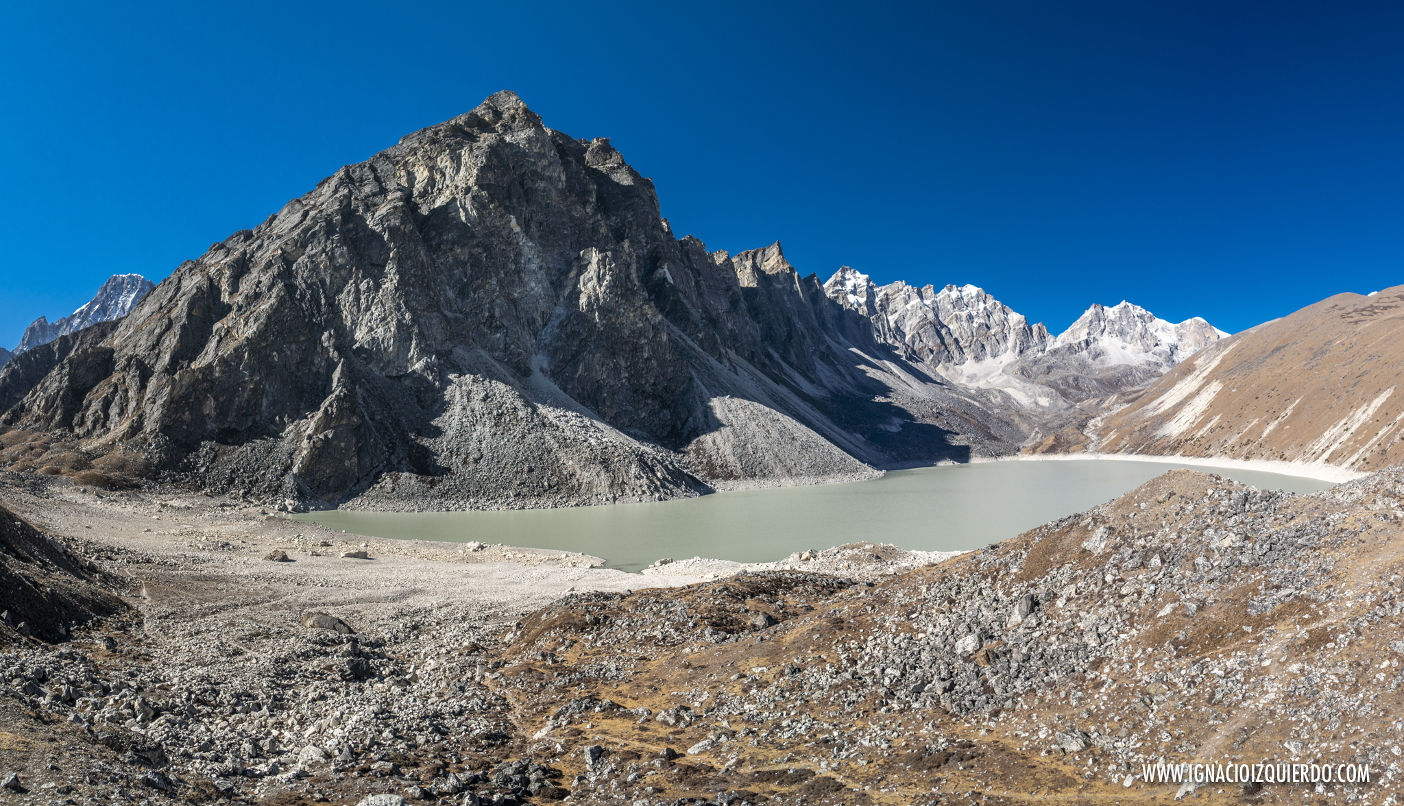 Aún nos separaban tres kilómetros de altura con la cima, pero delante nuestro se alzaba el Cho Oyu. Tres kilómetros de diferencia. 3000 metros. Se decía pronto, pero había que pensarlo fríamente para tener una dimensión de la escala. Prácticamente solos, junto al lago de Gyazumba, el circo de picos que le acompañaba era nuestro. Qué belleza. Qué maravilla. Incluso desde allí también el Everest, el Lhotse y el Nuptse se sumaban a la fiesta de una panorámica gloriosa. 3 ochomiles juntos, acompañados por los 7952 metros (casi otro) del Gyanchung Kang. Era una vista hipnótica. La seducción de la desolación. El Cho Oyu. La diosa turquesa.