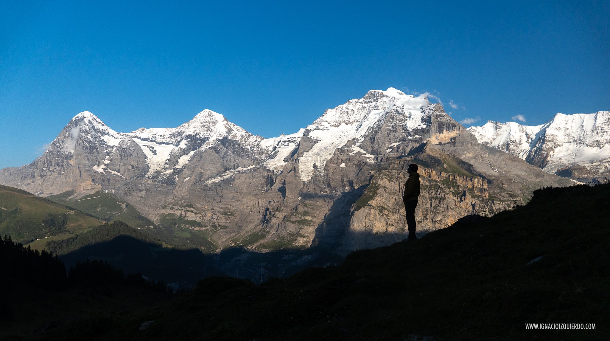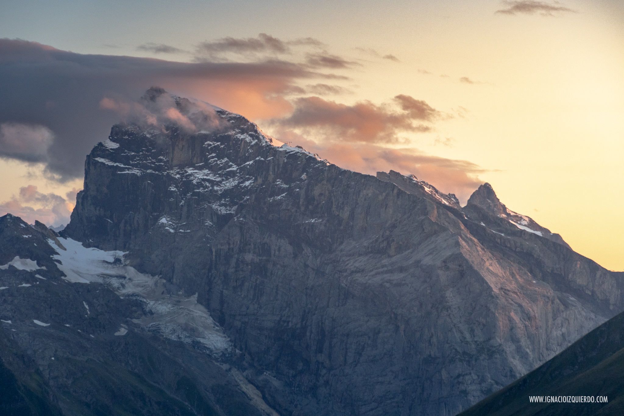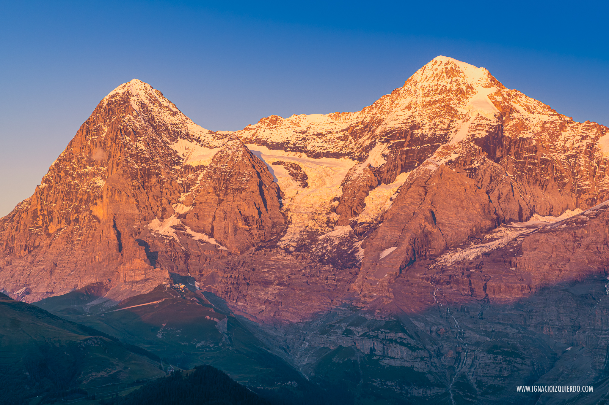 El Eiger (3970 m.) con la estación de Eigergletscher (2320 m.) a sus pies y el Mönch (4110 m.) al atardecer visto desde algún punto por encima de Mürren.
