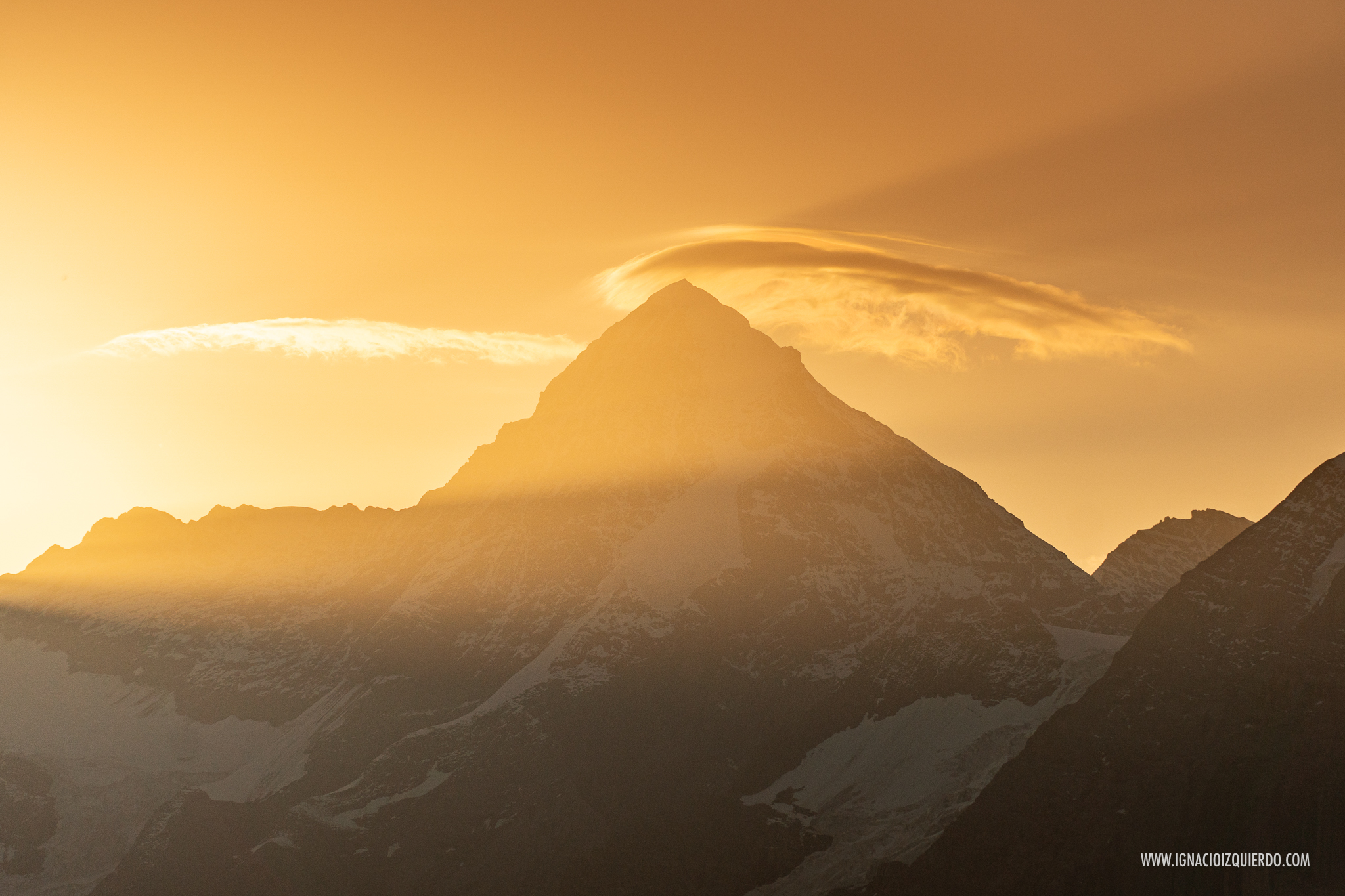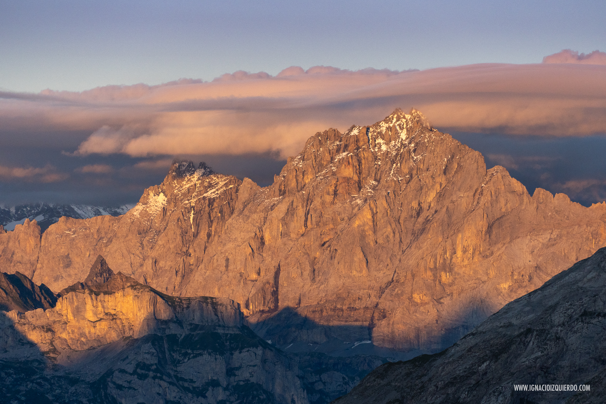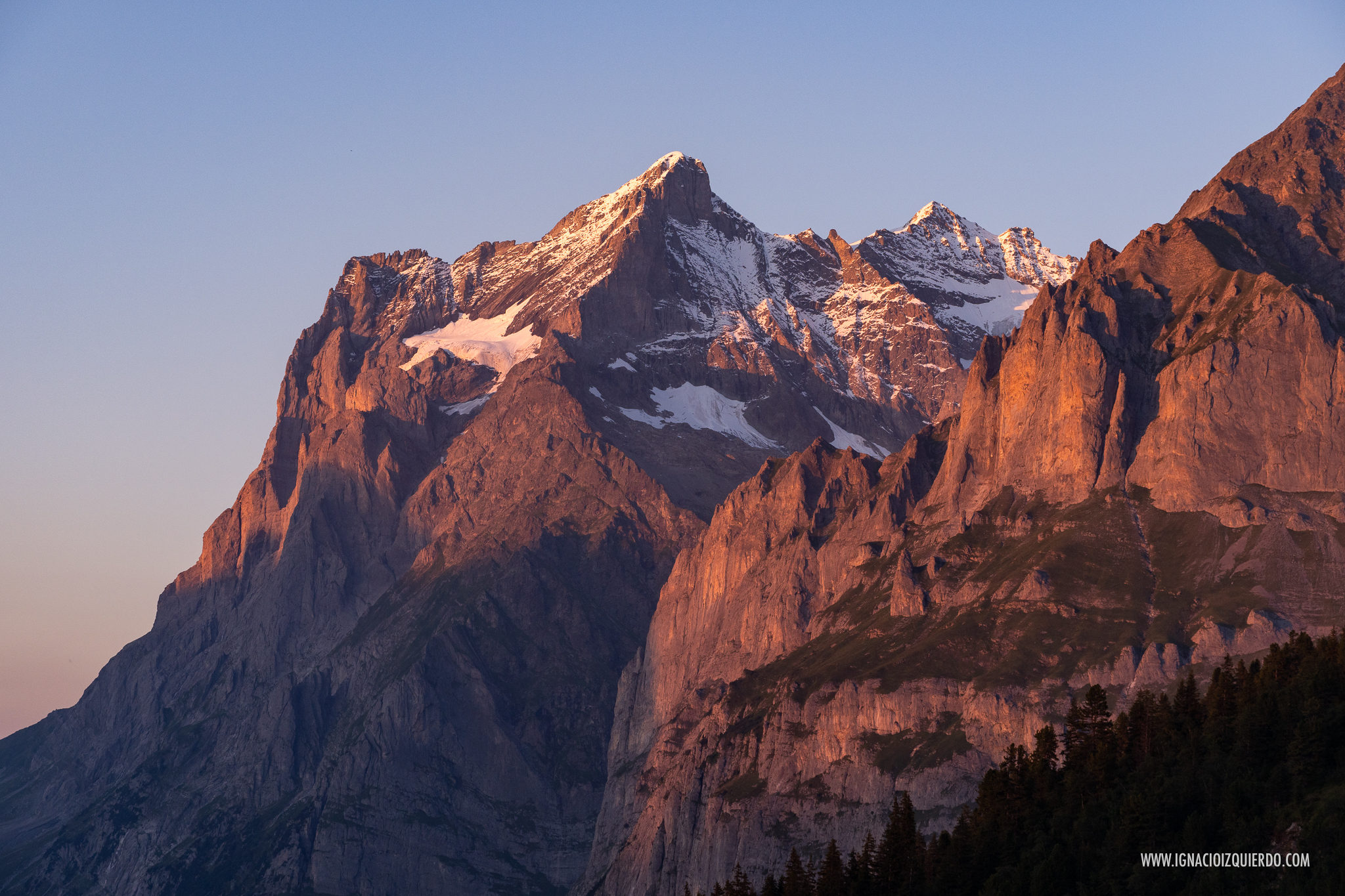 El Eiger (3970 m.) con la estación de Eigergletscher (2320 m.) a sus pies y el Mönch (4110 m.) al atardecer visto desde algún punto por encima de Mürren.