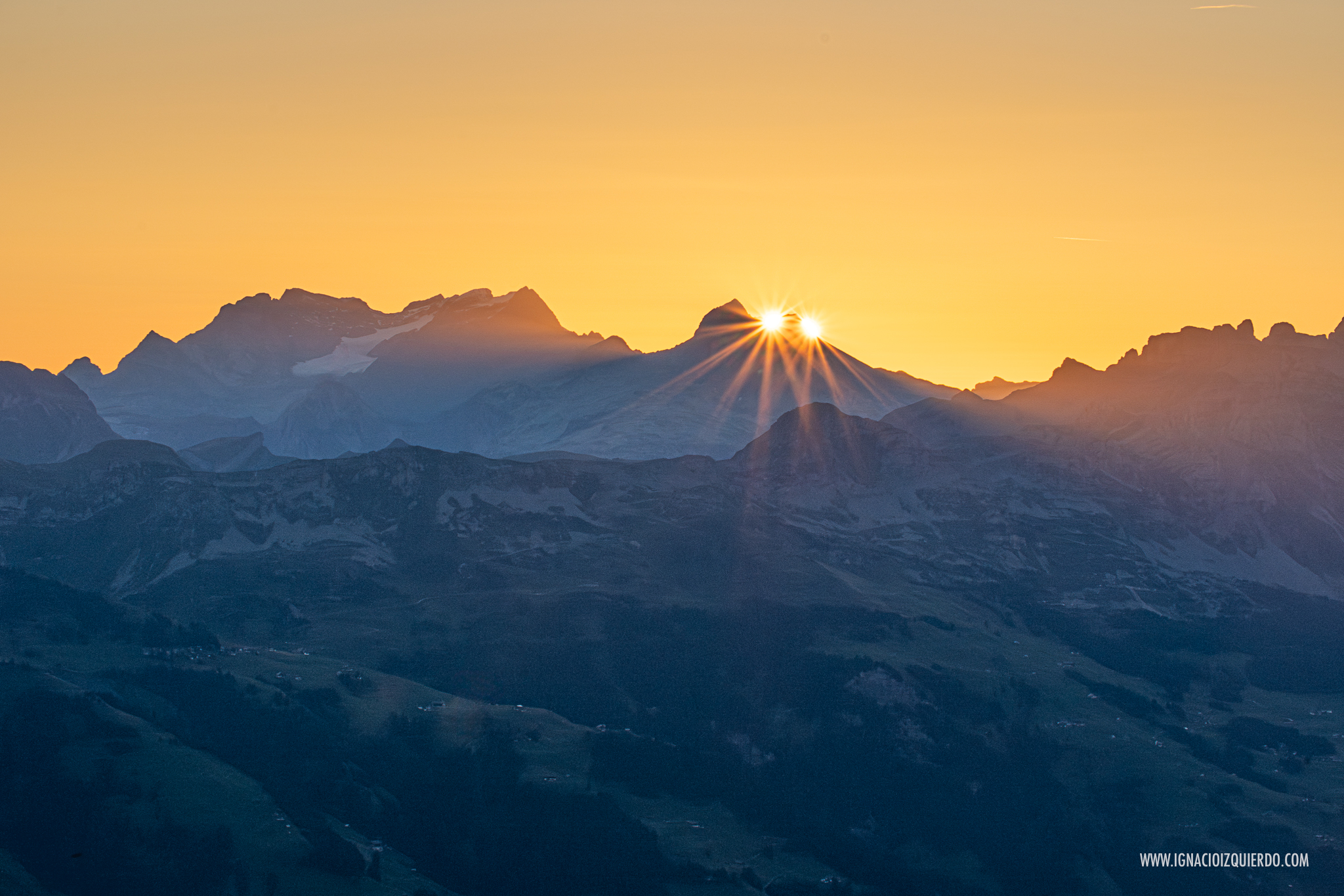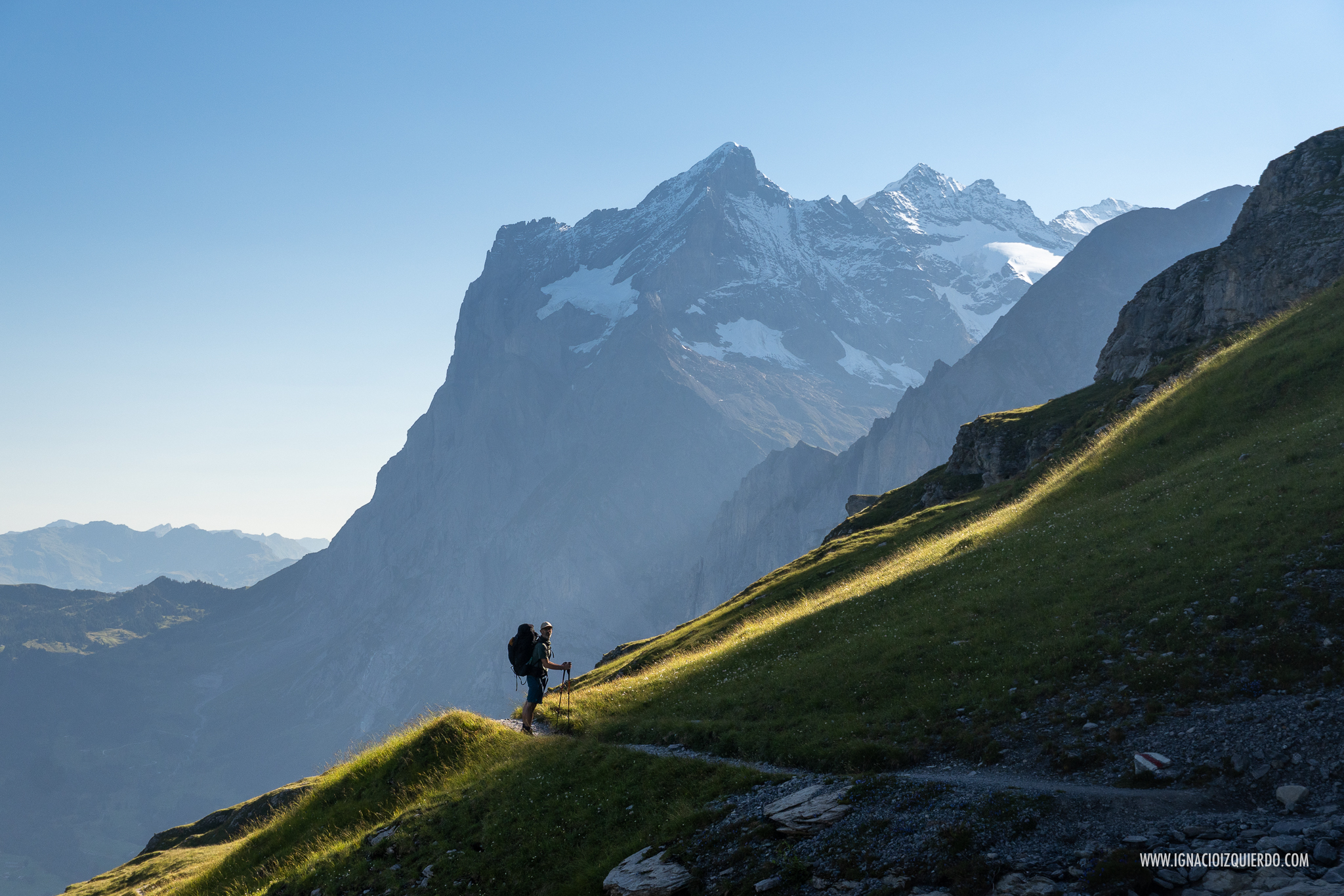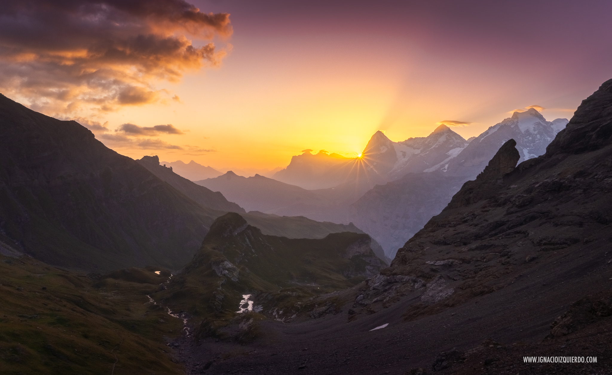 La belleza del amanecer desde el paso de Sefinafurgga (2611 m.). A la izquierda del sol naciente se puede ver el macizo del Wetterhorn (3692 m.) y a su derecha el Eiger (3970 m.), el Mönch (4110 m.) y el Jungfrau (4158 m.)