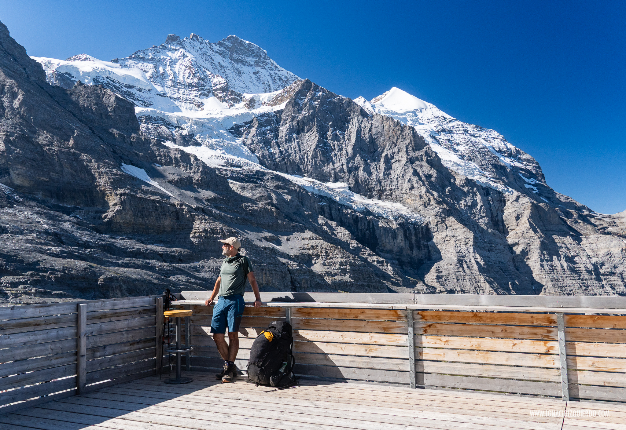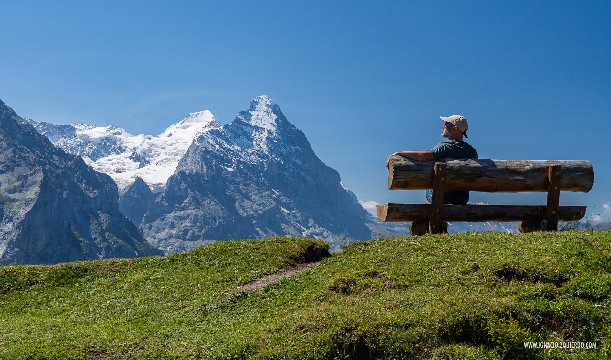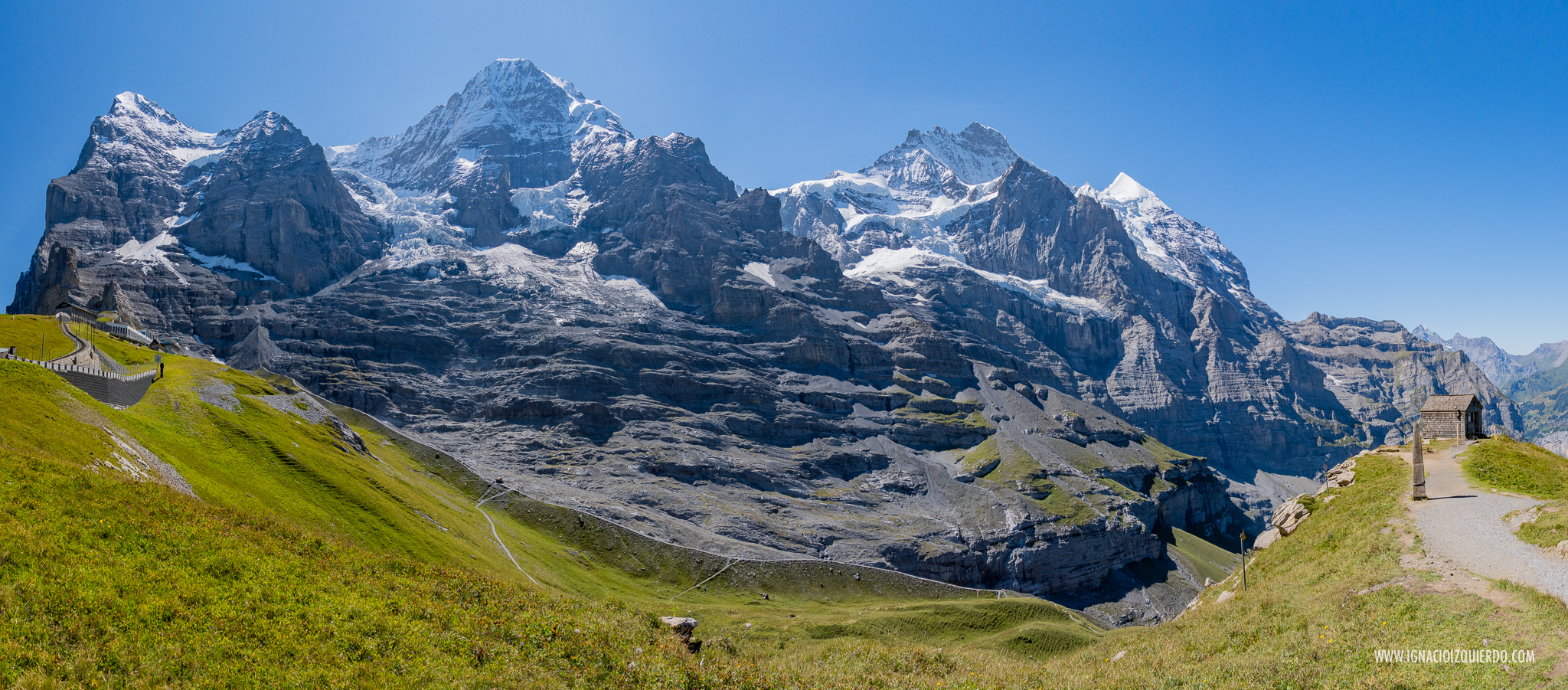La impresionante panoramica en la bajada entre la estación de Eigergletscher y Kleine Scheidegg. De Izquierda a Derecha: el Eiger (3970 m.), el Mönch (4110 m.), el Jungfrau (4158 m.) y el Silberhorn (3699 m.)