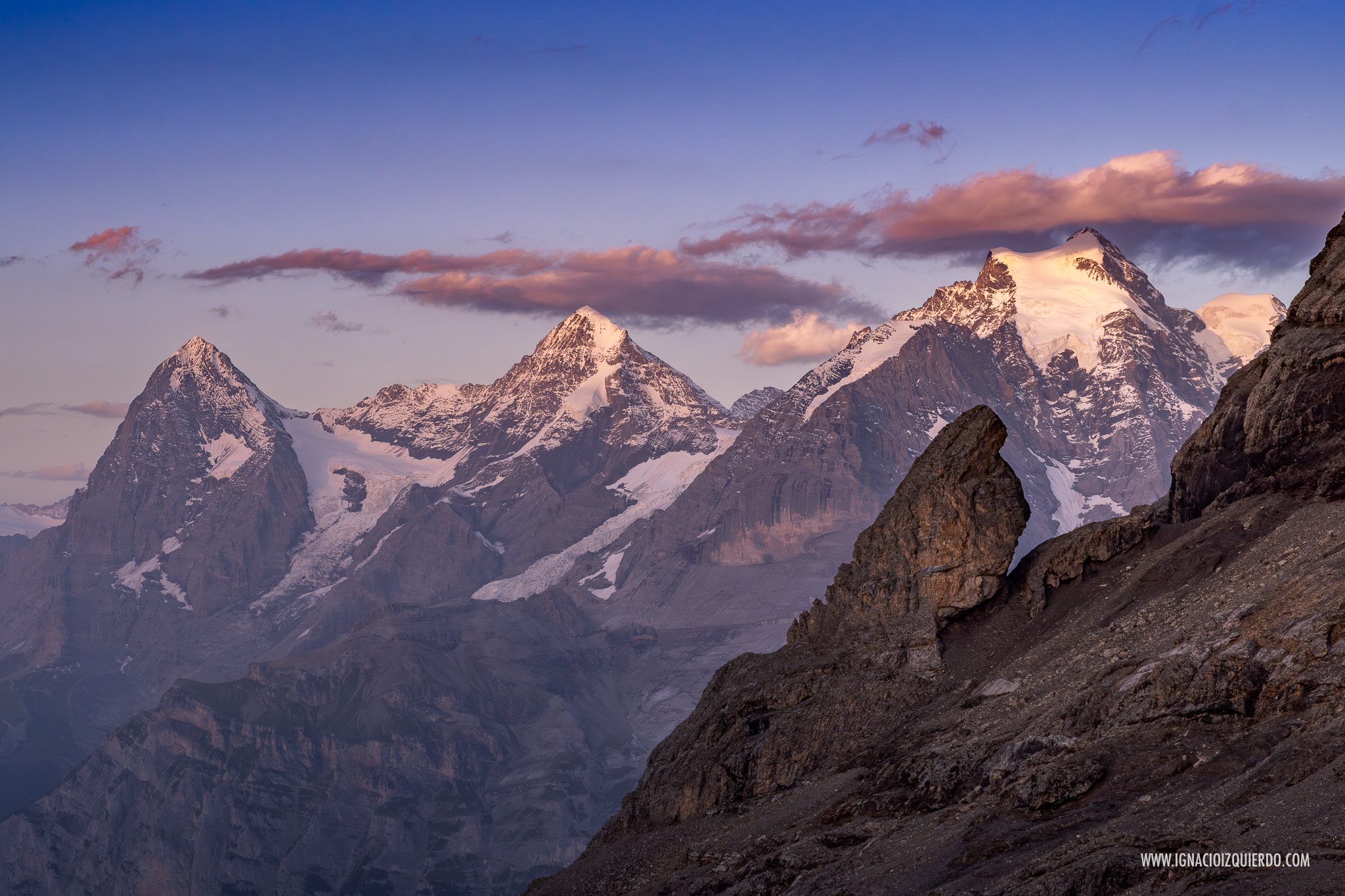 la santa trinidad: el Eiger (3970 m.), el Mönch (4110 m.) y el Jungfrau (4158 m.) al anochecer desde el paso de Sefinafurgga (2611 m.)
