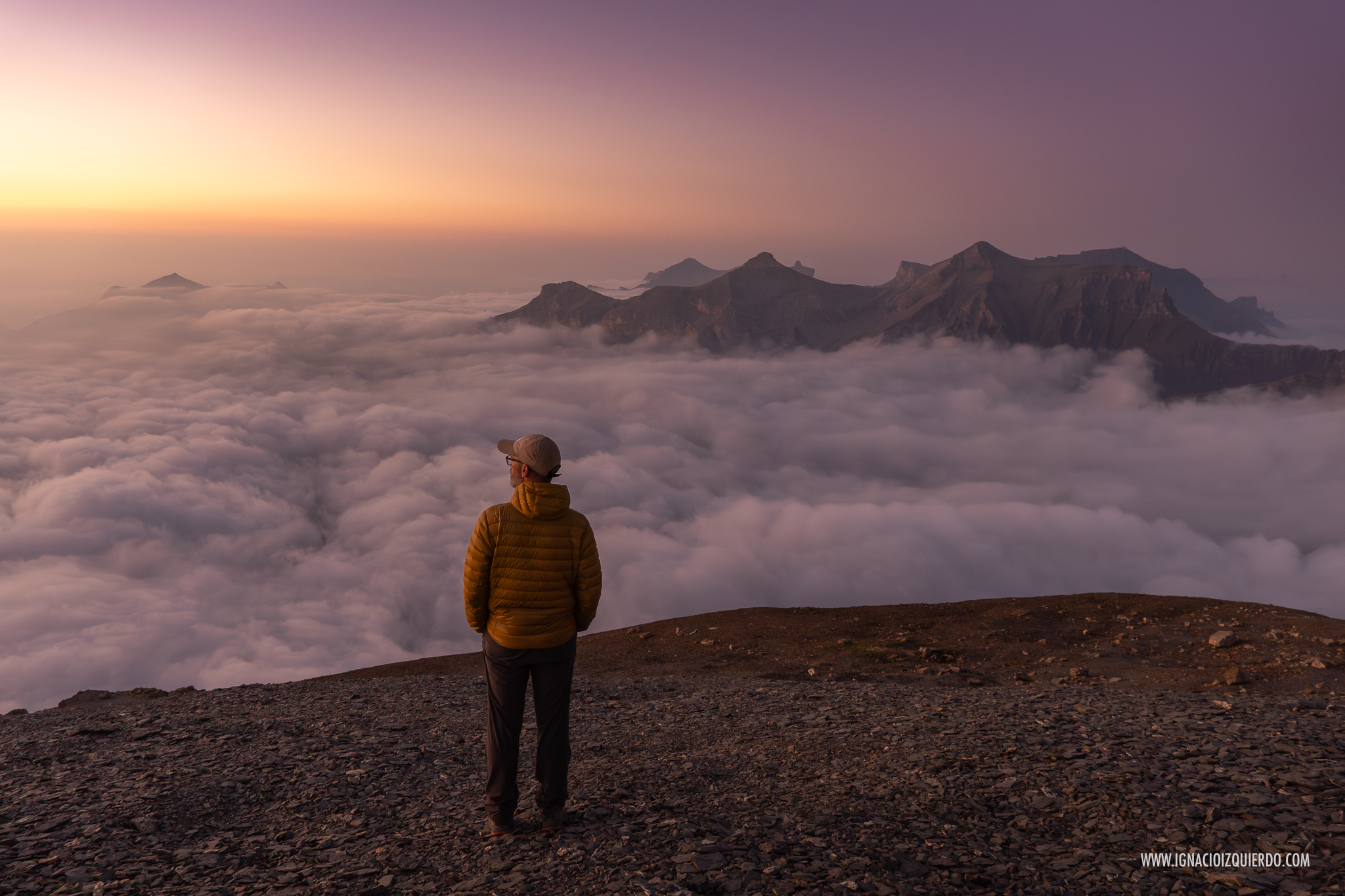 Anochece sobre un mar de nubes desde el refugio de Blümlisalp (2835 m.) el punto más alto de la Via Alpina Suiza.