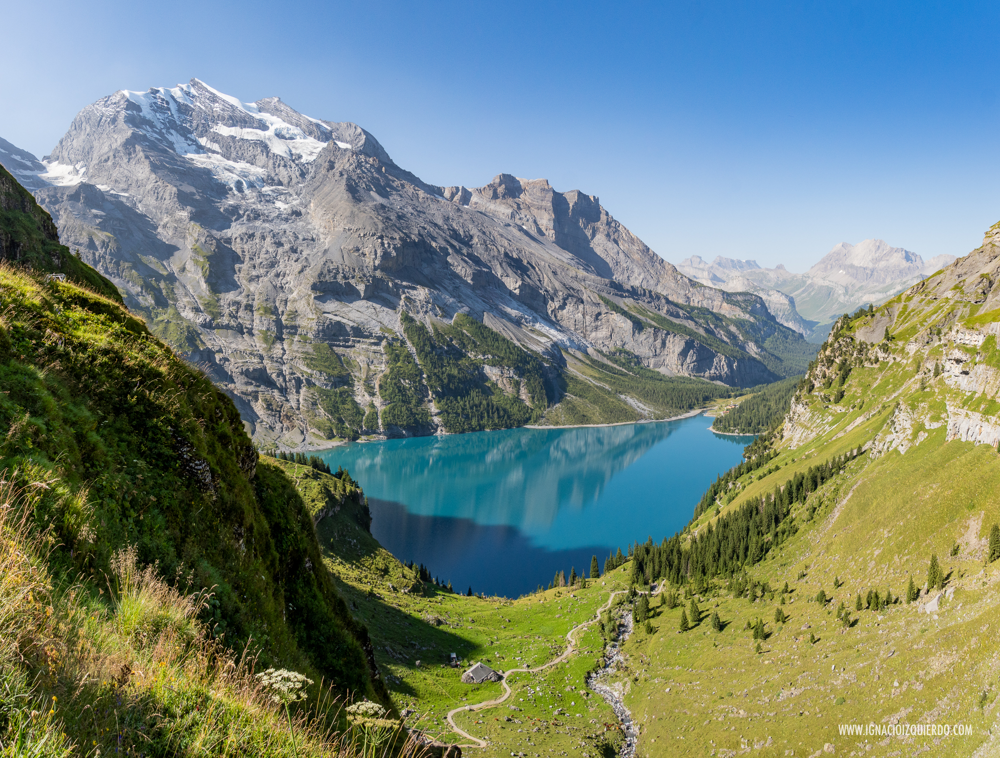 La posta perfecta de Suiza, el precioso lago de Oeschinensee (1578 m.) coronado por el Doldenhorn (3638 m.)